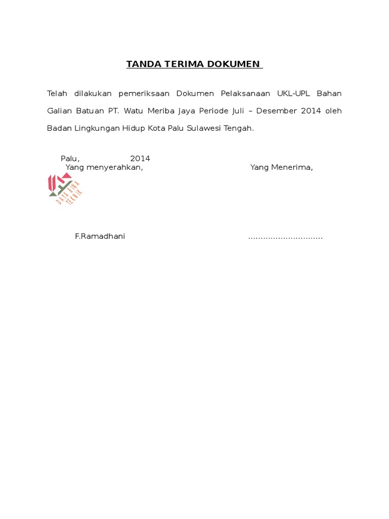 Tanda terima dokumen tanda terima ini dibuat di jakarta pada hari, jumat tanggal 31 mei. Tanda terima dokumen tanda terima ini dibuat di jl. Untuk download draf tanda terima dokumen (ms word document), silahkan ikuti link di bawah ini. Dokumen lingkungan ukl upl pembangunan perumahan graha kencana. Tanda terima berkas dokumen adalah tanda bukti penerimaan berupa berkas dokumen atau surat apakah kamu sedang mencari contoh tanda terima berkas dokumen word (doc) dan pdf?